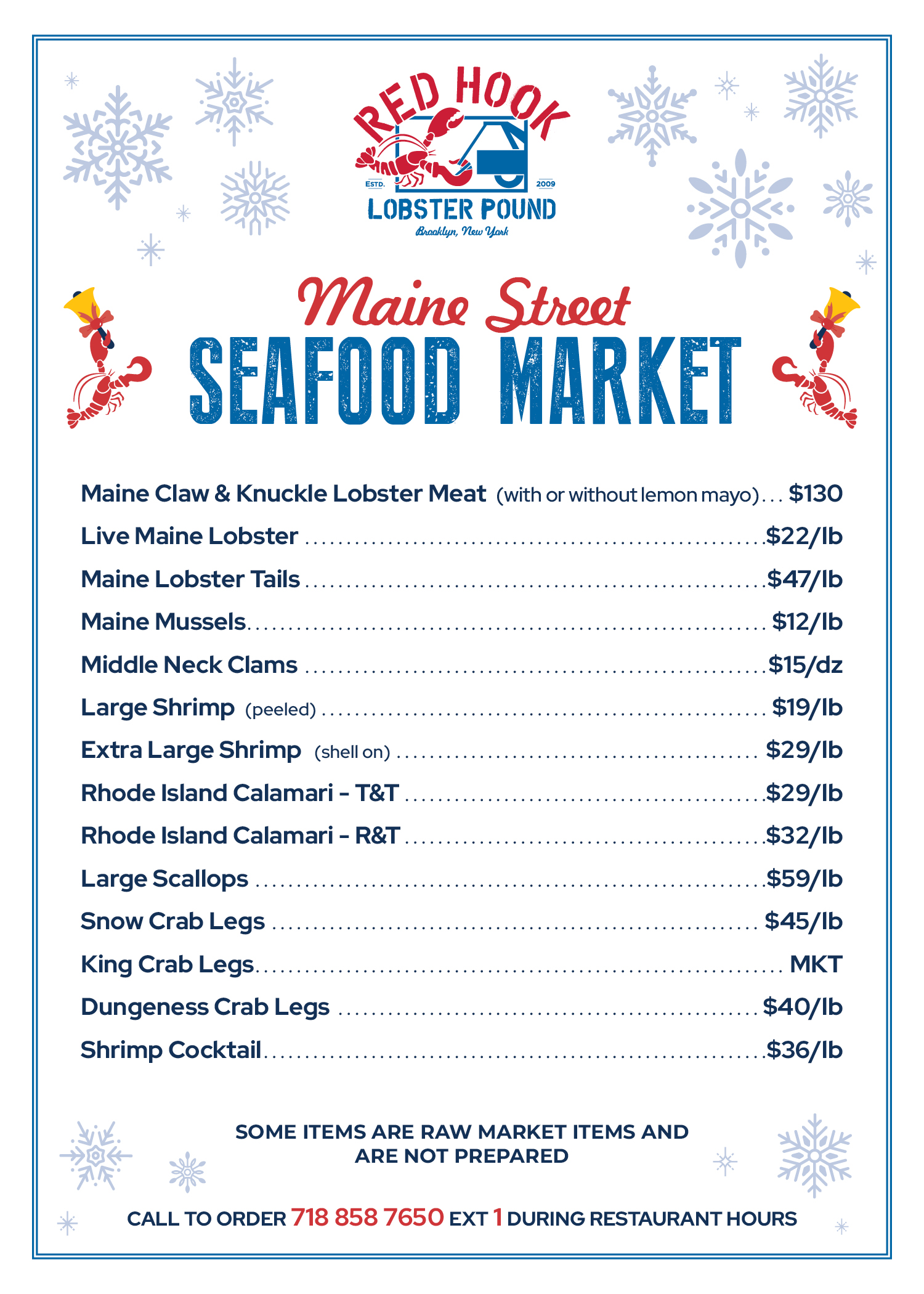 Holiday Seafood Market December 22, 2025 12:00 PM until December 31, 2025 07:00 PM The holidays are here and we have your seafood needs taken care of!For all pick ups, please be sure to order at least 24 hours in advance